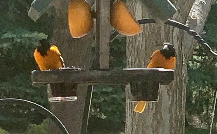 Predictably, summer will arrive, filling my senses with more memories and pleasures. The heat of the early summer sun beating down on my face warming my spirit as if it too is awakening from a long winter’s nap. The sound of the frogs in the pond nearby, croaking their mating calls long into the night. Summer birds returning home, the loud ruckus of varying calls, their happiness is contagious. I wait with anticipation for the first Baltimore oriole sighting and take pictures as it lands on the feeder. There will be more to follow, the bright orange color adding a cheeriness to the world unfolding before me. If I am lucky, and remain fastidious about replacing the sticky grape jelly and oranges, during the months ahead, they will bring their offspring and teach them how to feed themselves, keeping a watchful eye until such a time that they might fend for themselves. Smells of sunscreen, bike rides, hikes and long days that roll well into the night where I sit on the porch and listen to the cicadas, and crickets and breath in the humidity of the day that is ending.
